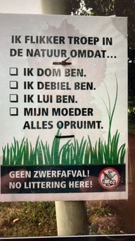 In het nieuwe jaar hopen we, tegen beter weten in, denk ik, dat het zwerfvuil afneemt en dat men gaat beseffen hoe verkeerd het is om afval zomaar van je af te gooien. Het is echt niet stoer om rommel in de berm of goot te gooien, je bent dan echt zielig als je jezelf verlaagt tot dat niveau. Je bent pas echt stoer en je maakt pas echt het verschil als je je vriendjes toont hoe het moet.